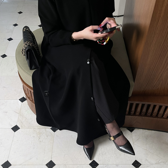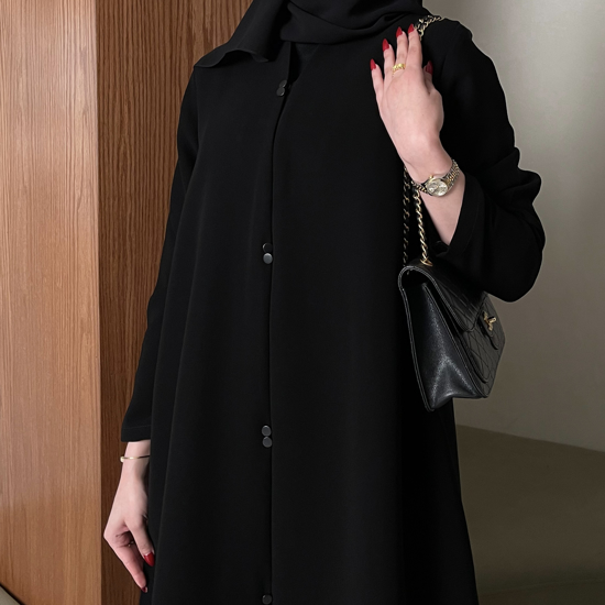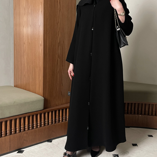 عباية سوداء بقصة كلوش انسيابية، تصميم سادة مزود بأزرار دائرية صغيرة على طول الأمام. مبطنة بالكامل مع تشطيب نظيف وأكمام مستقيمة