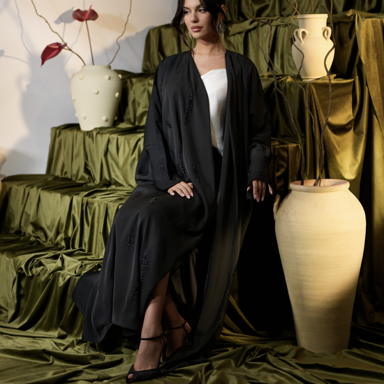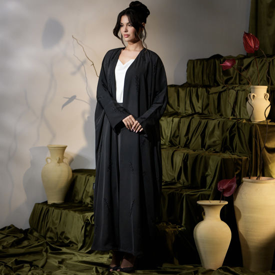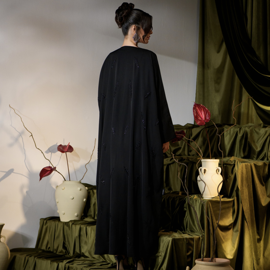 عباية سوداء بقصة بشت واسعة. تتميز بأكمام ضيقة. تتضمن شك يدوي وتطريز على شكل أغصان بأحجام مختلفة على كامل التصميم. مبطنة بالكامل. مصنوعة من قماش كريب ميليسيا كومفورت .