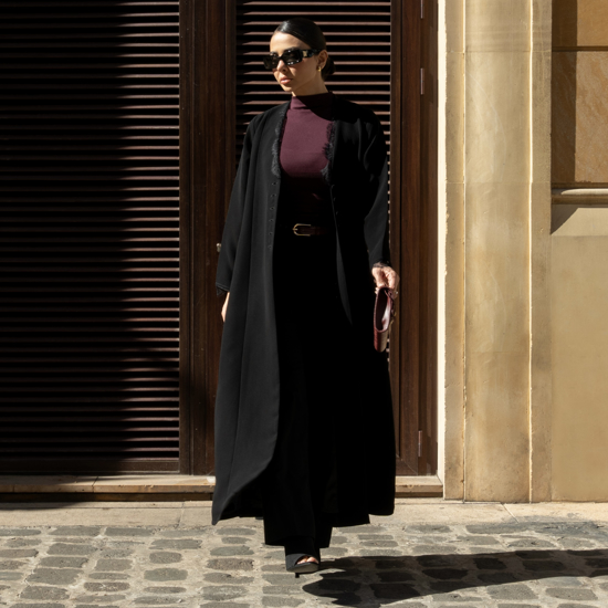 عباية كلاسيكية بلمسة أنيقة، مزينة بدانتيل ناعم على الياقة والأكمام،