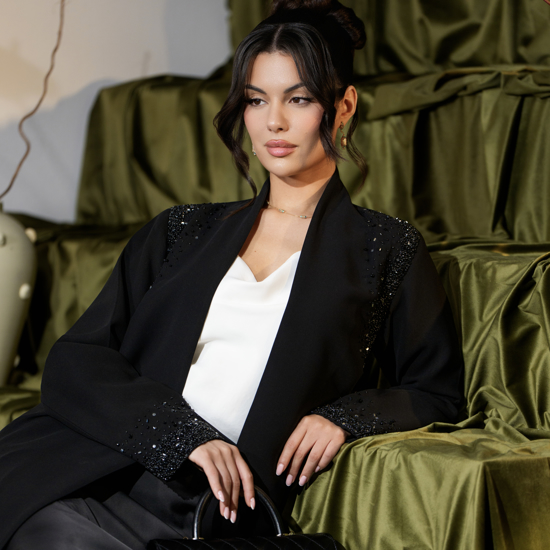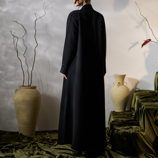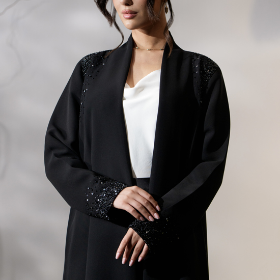 عباية سوداء بقصة مستقيمة مفتوحة من الأمام. تتضمن شك يدوي وخرز بتفاصيل دقيقة على الأكتاف والأكمام. تصميم بأكمام مستقيمة. مبطنة بالكامل. مصنوعة من قماش كريب ميليسيا بريميوم.