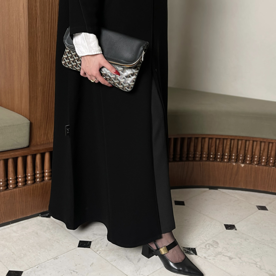 عباية بقصة كلوش خفيف. تتضمن خياطات (قيطان أسود) بخطوط طولية واضحة من الأمام والخلف. مبطنة بالكامل. مصنوعة من قماش كريب ميليسيا بريميوم