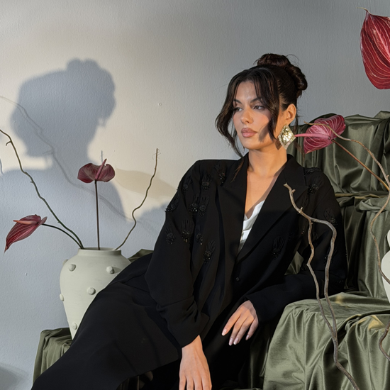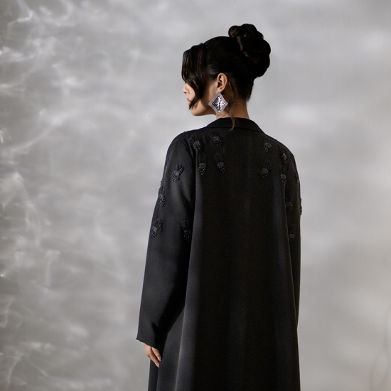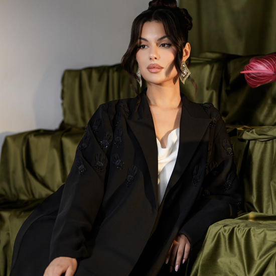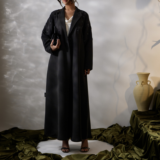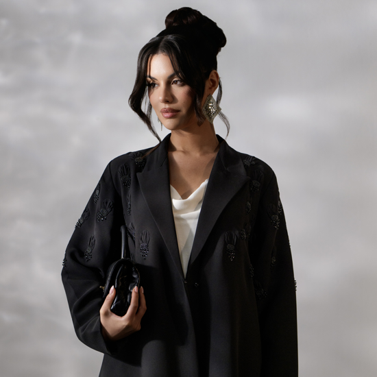 عباية سوداء مناسبات بقصة بليزر. تتميز بطبعة شك بارزة بتفاصيل مصممة في الجزء العلوي. تصميم مفتوح من الأمام بياقة بليزر وأكمام مستقيمة. مبطنة بالكامل. مصنوعة من قماش كريب ميليسيا بريميوم.