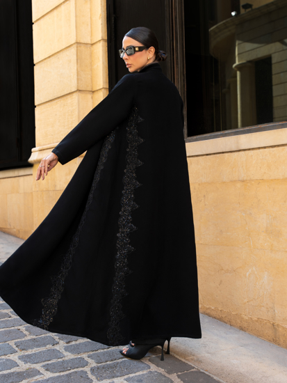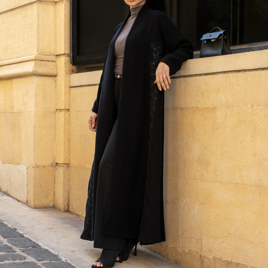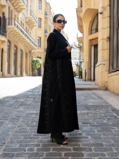 A luxurious abaya featuring intricate floral embroidery cascading vertically along both sides, elongating the silhouette and enhancing its refined elegance. The embroidery is delicately accented with subtle sequin shines that catch the light softly, giving the abaya a graceful and sophisticated presence.