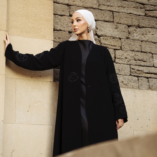 An elegant abaya adorned with delicately embroidered floral patterns on the sleeves and front, blending simplicity with elegance. A refined choice for chic everyday occasions and graceful looks