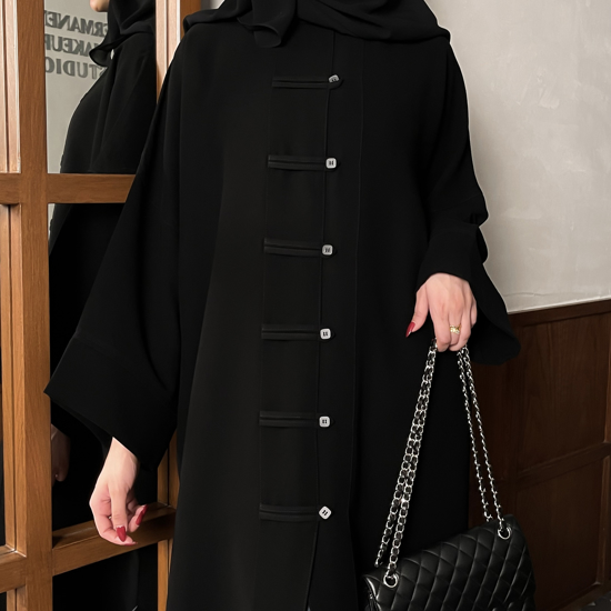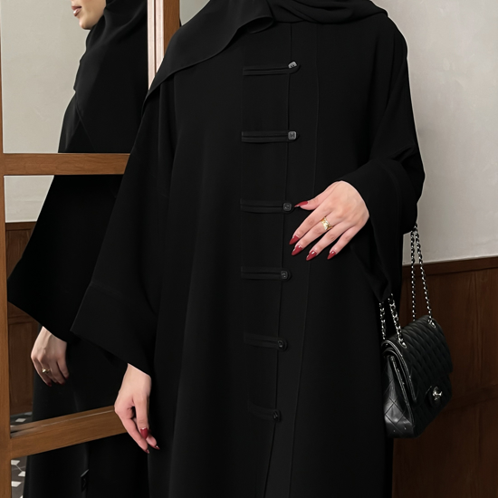 عباية سوداء بقصة تشاينيز مستقيمة واسعة، تتميز بخط أزرار أمامي بتفاصيل مرتبة و أكمام واسعة