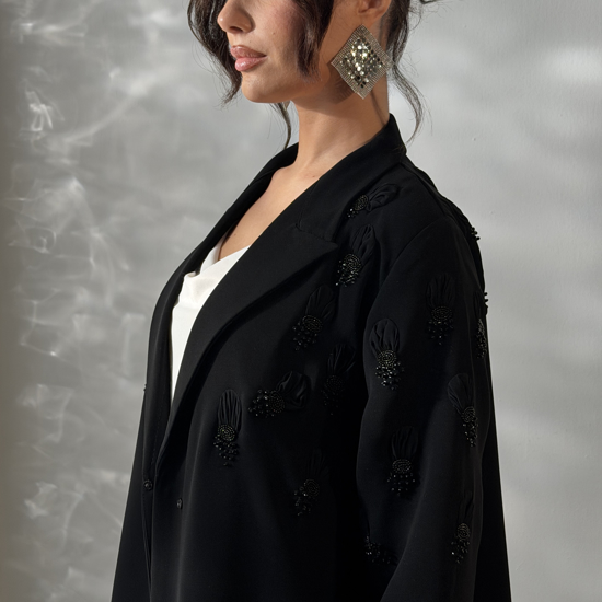 عباية سوداء مناسبات بقصة بليزر. تتميز بطبعة شك بارزة بتفاصيل مصممة في الجزء العلوي. تصميم مفتوح من الأمام بياقة بليزر وأكمام مستقيمة. مبطنة بالكامل. مصنوعة من قماش كريب ميليسيا بريميوم.