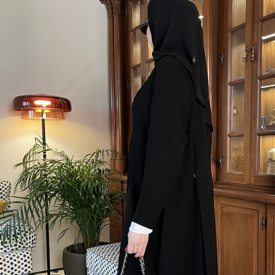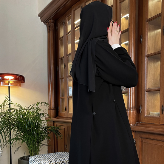 Black abaya in a straight blazer cut. Features side buttons with defined vertical panel lines and straight sleeves. Made from Melissia Premium Crepe fabric.